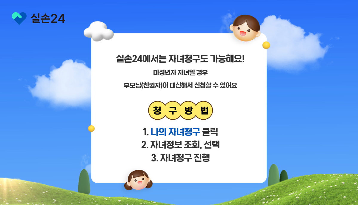 자녀가 만 19세미만의 미성년자이고 부모님이 대한민국 국적의 친권자가 맞다면 "나의 자녀청구" 청구진행 과정 중 공공 마이데이터에서 친권자 성명, 친권자 주민등록번호, 자녀 성명 순으로 입력 후해당 화면 하단의 "제공 요구합니다" 버튼 선택하시면 자녀가 조회됩니다. ※ 친권자 성명 오타, 친권자 주민등록번호 오타, 자녀 성명 오타 발생시 조회 되지 않음.